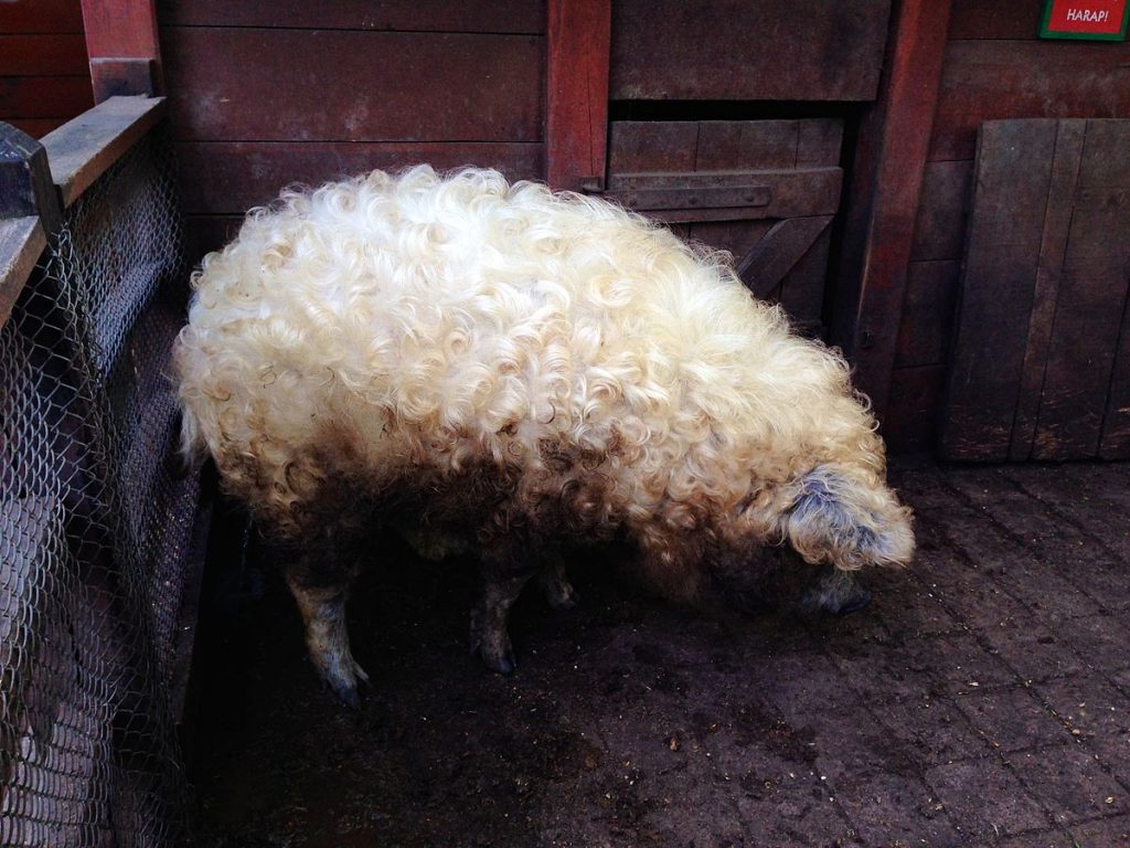 The Mangalica is a Hungarian breed of domestic pig. They are the only existing pig species with a woolly coat. The Mangalica pig has a thick, curly coat of hair. It is often known as the “Sheep-Pig” because of the abundant woolly fur on its whole body. They have thick curly locks on their fur and a lot of fat on their body. They are an ideal choice for hobby farms as they are fat, low-maintenance animals. They are bred for their meat and pork, with 160 such farms in Hungary alone.