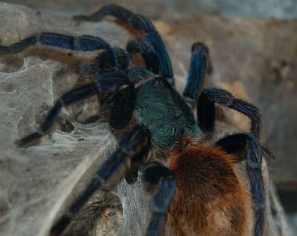 The Green Bottle Blue Tarantula is a native of the Paraguaná Peninsula, Venezuela. It is known for the most dramatic coloring of any spider species. They have bright blue legs, with a blue-green carapace. Their orange abdomen gives them an additional colour touch. They have an average lifespan of 8 to 22 years. They originate from a very harsh and dry climate from the desert areas of northern Venezuela, Paraguana, Their vibrant and vivid colors make them hard to miss.