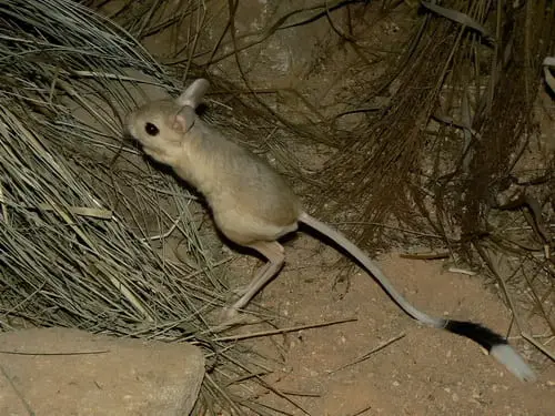 The pygmy jerboa is a rodent which is endemic to Baluchistan province in Pakistan. It has a body length of 4.4 cm and weighs about 3.75 g. These are nocturnal creatures that move in wide hops with the aid of their long tail. They live in burrows tunnelled under small bushes. They feed on the leaves of desert vegetation. There is deficient data on them for IUCN to classify their status.